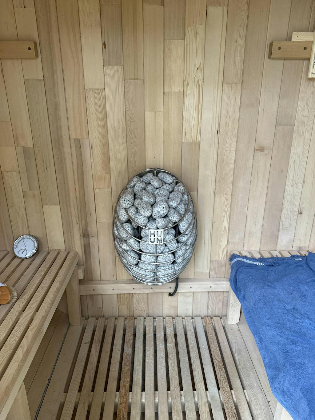 Traditional saunas use either an electric heater or a wood stove to heat the air in the sauna. Sauna rocks sit directly on top of the heater or stove, and when you ladle water over the sauna rocks steam is created to humidify and further heat the sauna. Traditional saunas typically get up to about 190° F, but some people get theirs over 200° F!