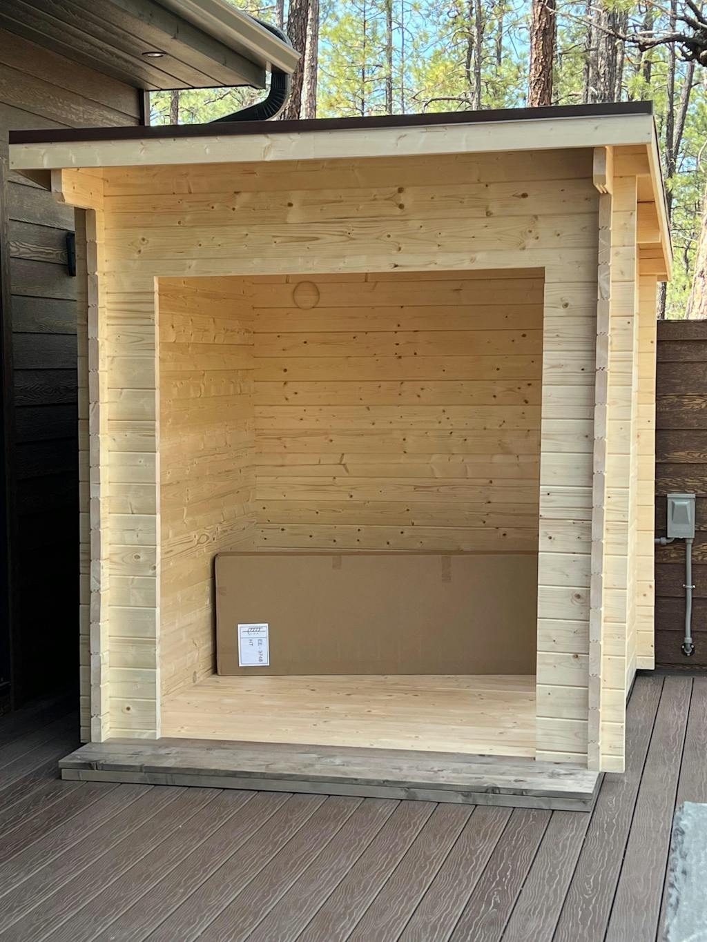 Most of our indoor saunas should not go outside, however, all Enlighten Saunas are indoor/outdoor and only require the installation of the peak roof to use outside. Pretty cool!
