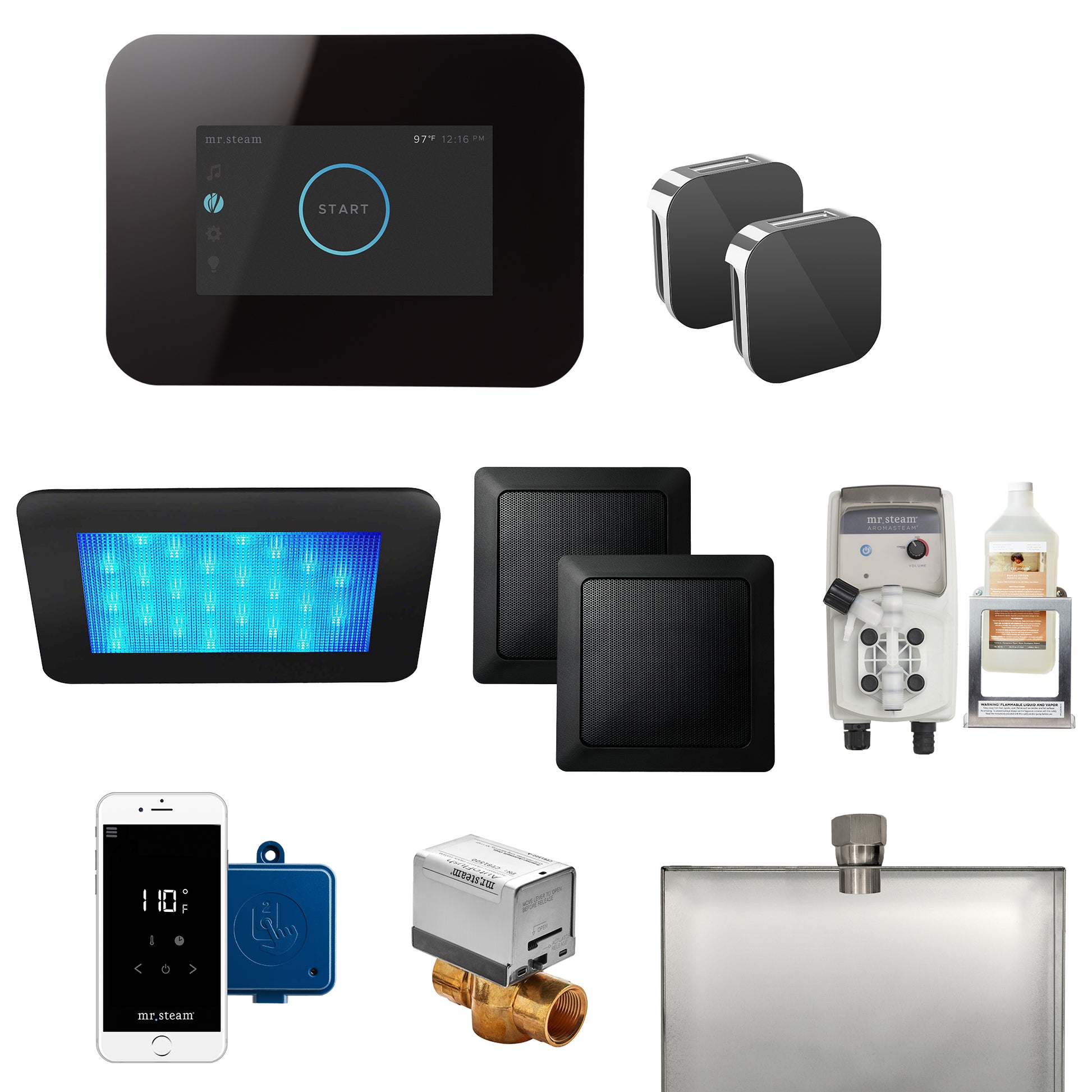 Mr.Steam® iDream® Max Package includes: (1) isteam®3 Touch Screen Control (2) AromaSteam Glass SteamHeads in black (1) SteamLinx (1) Max AutoFlush® (1) Max Condensation Pan (1) AromaSteam Oil Delivery System with Caddy (1) ChromaSteam® 3 Mood Lighting System (1) AudioSteam® 3 System (1) Pair of Square In-shower Music Therapy® Speakers in black (1) Liter Eucalyptus Oil. For generator models MX4E to MX6E