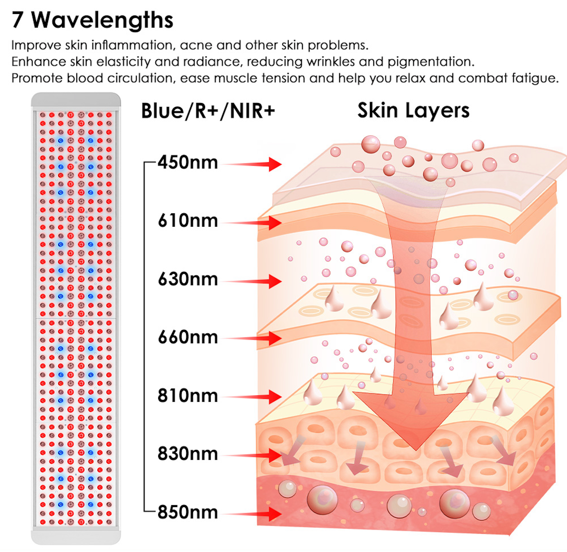 This is Renew’s most versatile light therapy panel. Designed to deliver expansive, full-body coverage, it combines red, near-infrared, and blue light in a high-output design. With an adjustable stand, the panel can be positioned vertically, horizontally, or anywhere in between, making it easy to use while lying down, sitting, or standing.